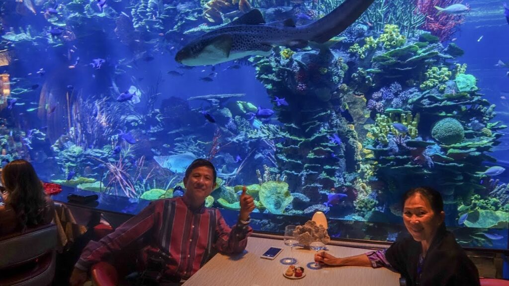 A fine-dining seafood restaurant that feels like eating inside an aquarium. The floor-to-ceiling seawater tank surrounds guests with marine life as they dine.
