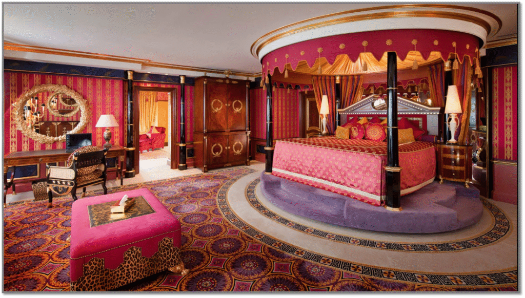 - Royal Suite 780 m², private elevator, cinema, gold décor $20,000 – $25,000